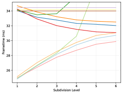 Figure 8. Plots over how the average frame-times changes for increasing subdivision levels on a RTX 3080.